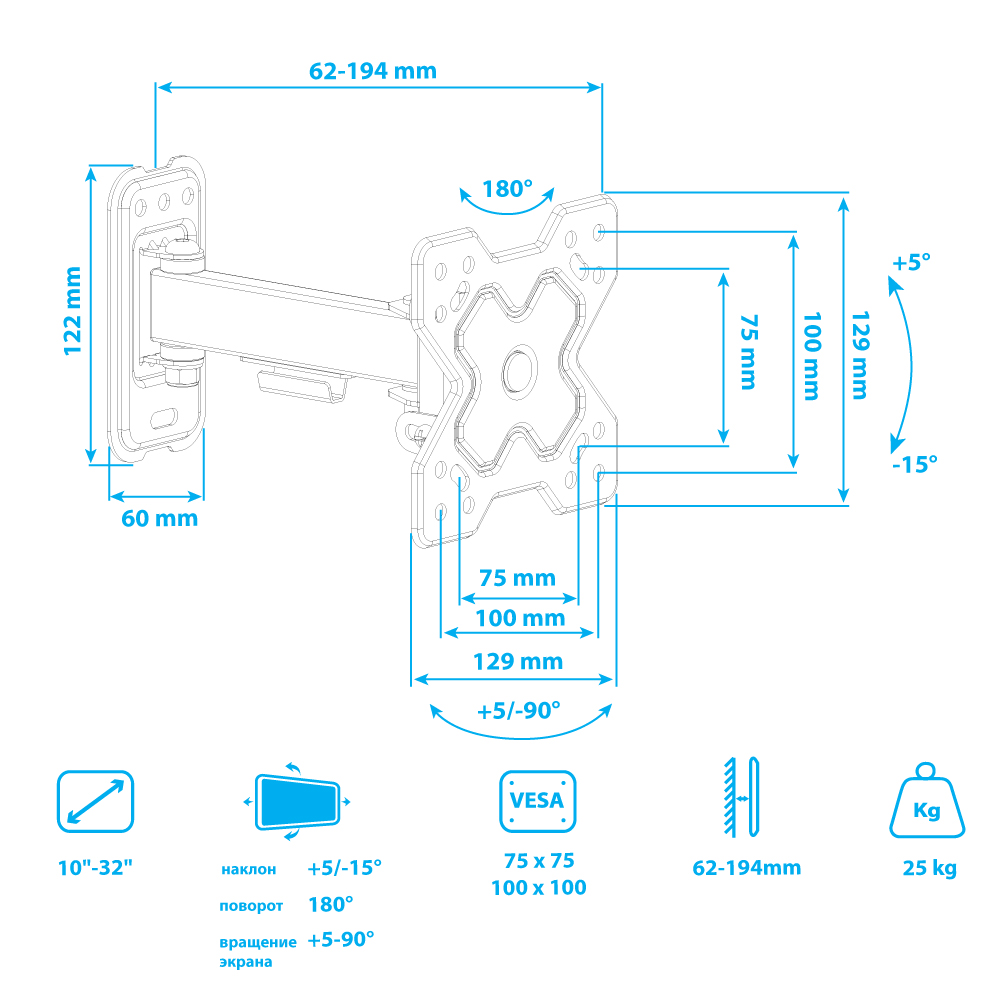 10"-32" Кронштейн Arm media MARS-5 black, max 25 кг, max VESA 100x100 мм