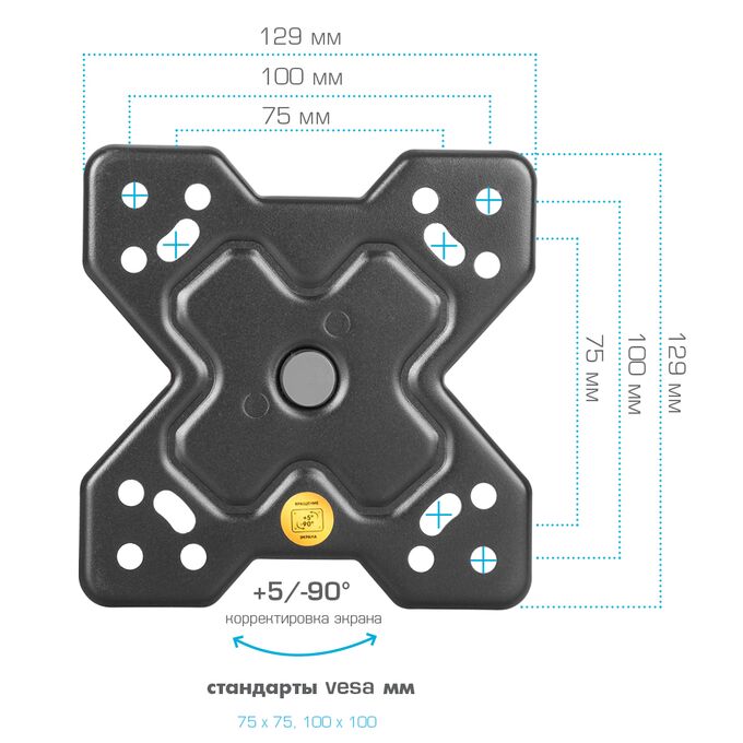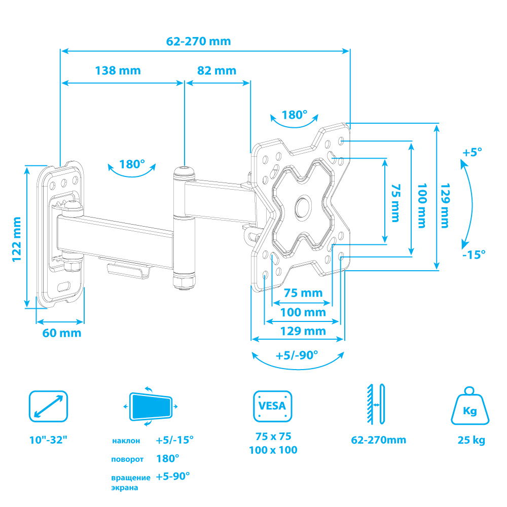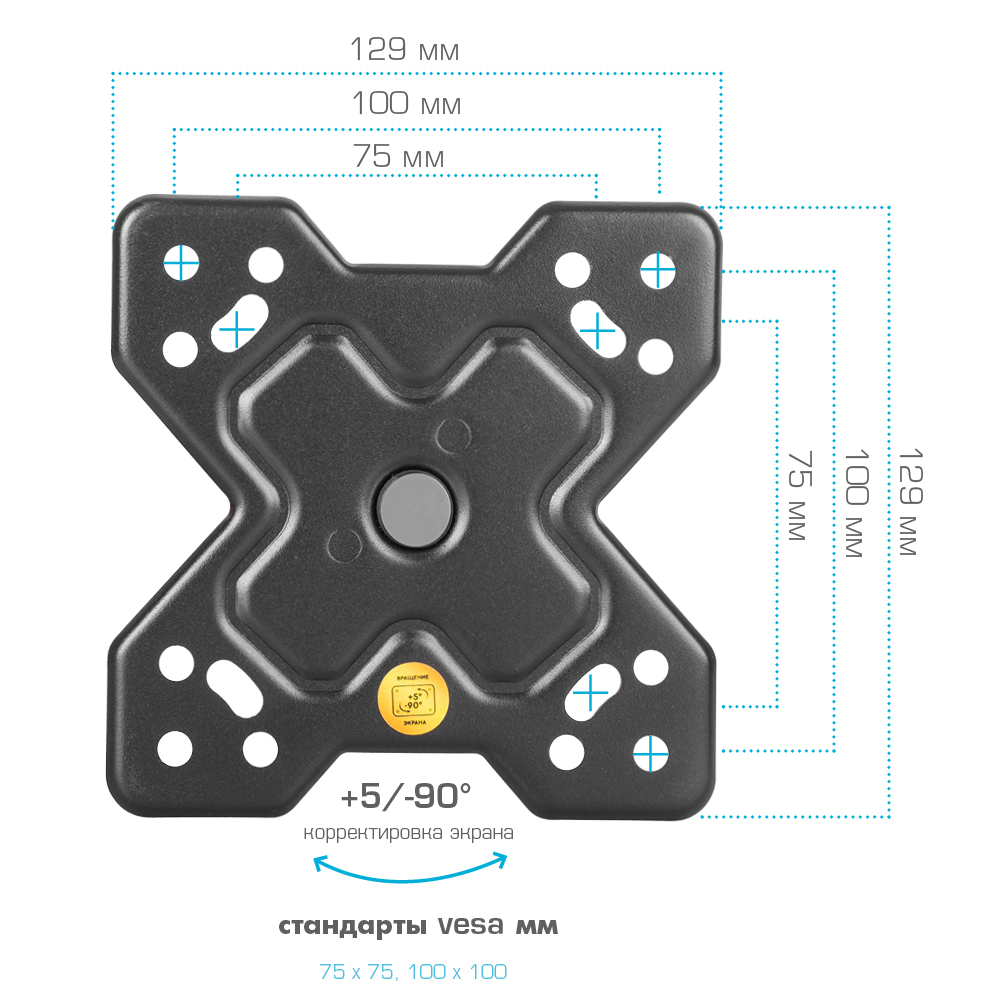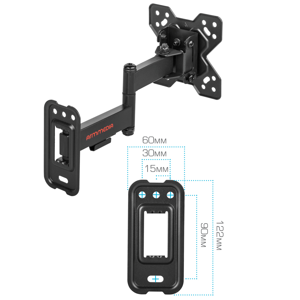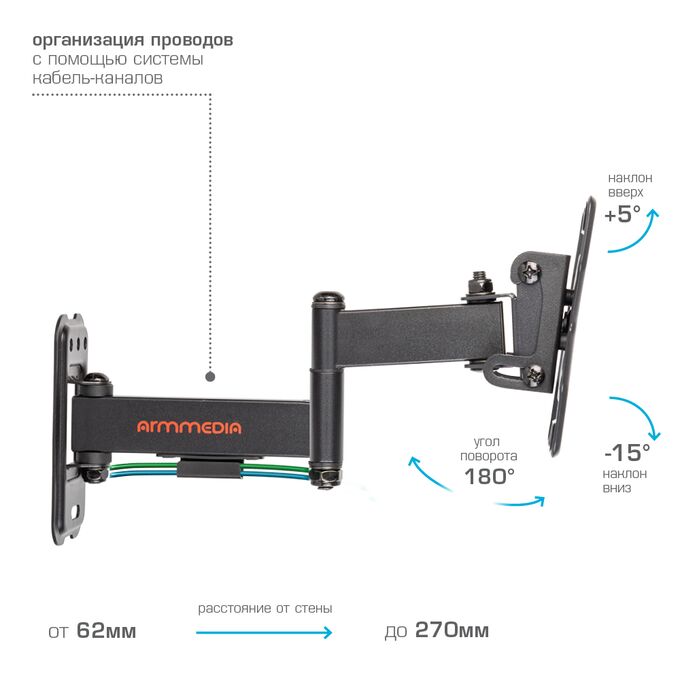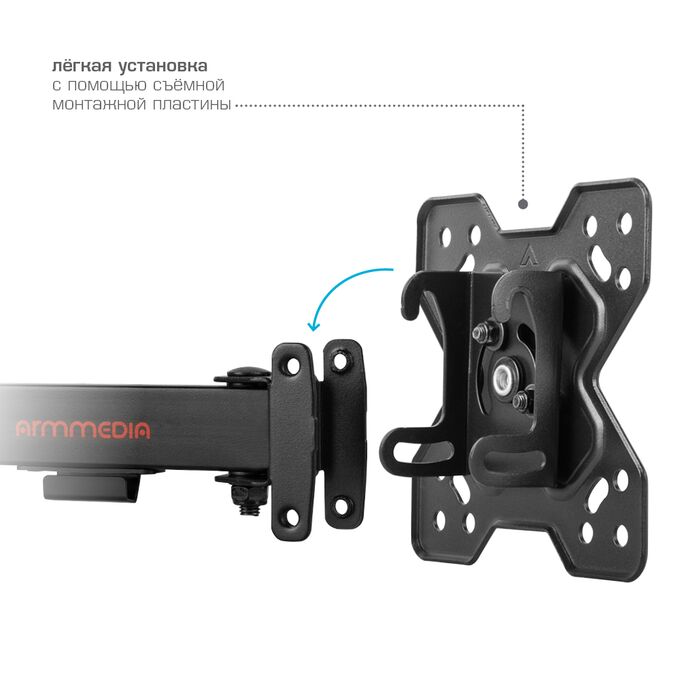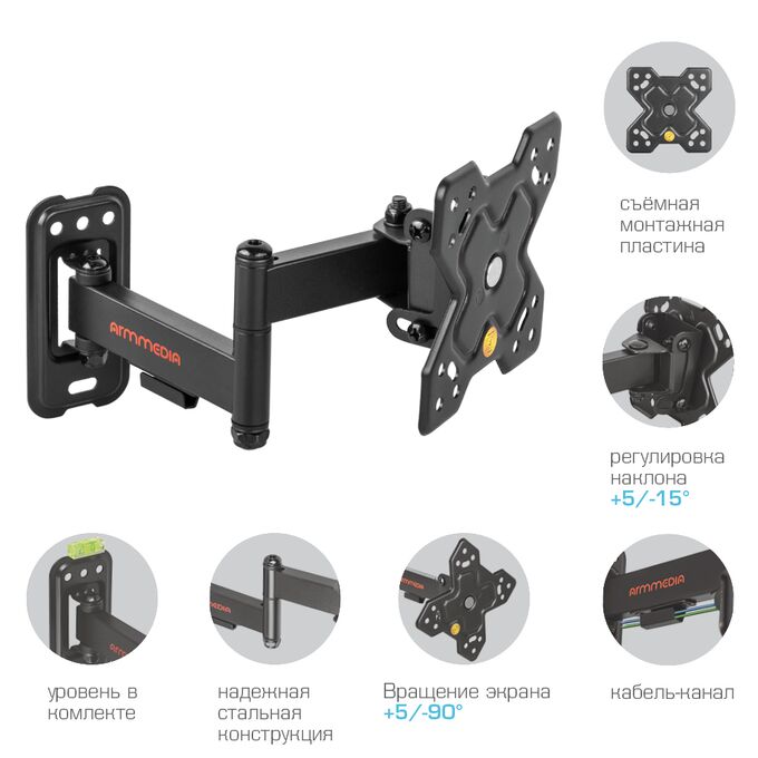 Надежная стальная конструкция, Универсальный - телевизор на кронштейне можно наклонить, повернуть и сдвинуть к стене, Легкий монтаж телевизора - благодаря наличию съемной монтажной пластины, Кабель-канал, Вращение экрана +5° -90°