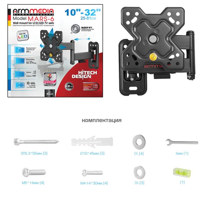 Кронштейн для телевизора, комплект ключей и крепежа для установки ТВ, навесной уровень, подробная инструкция на русском языке