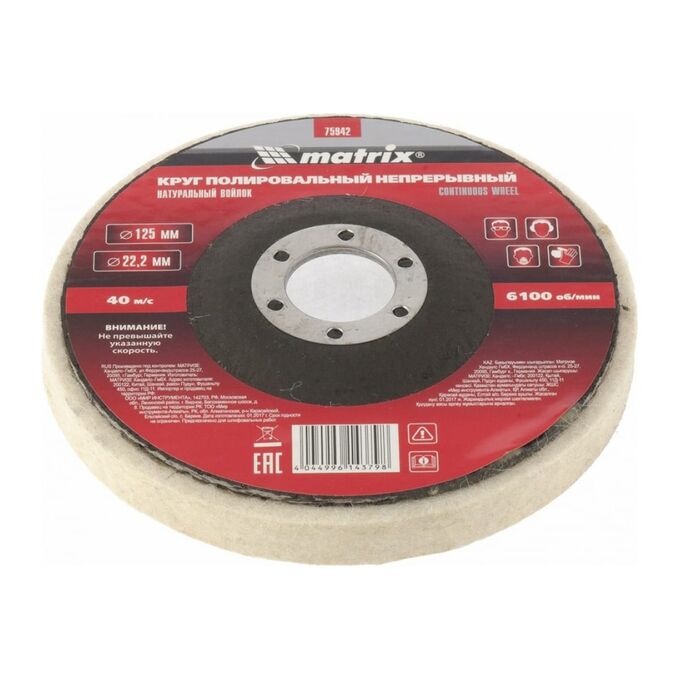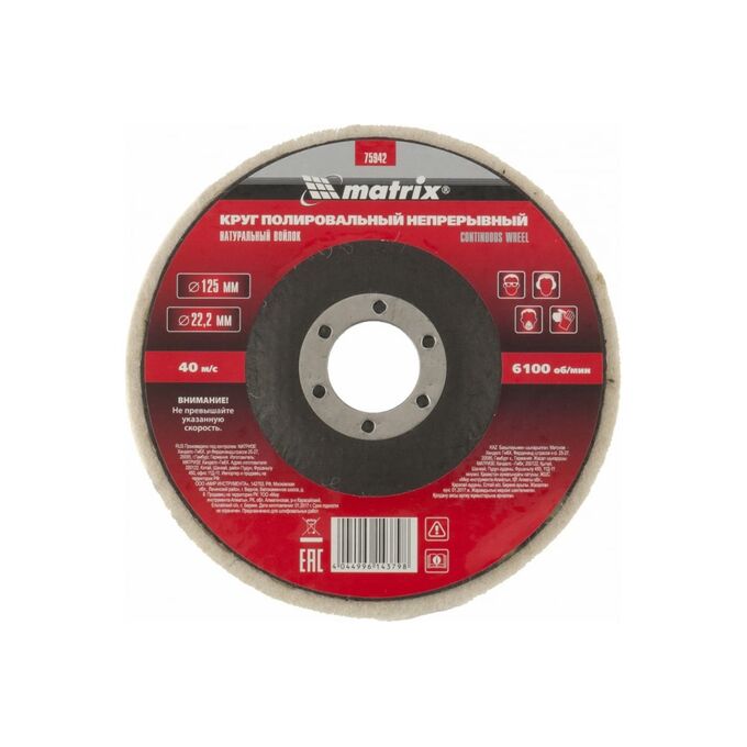 Непрерывный полировальный круг из натурального войлока Matrix 75942, 125 х 22,2 мм - оснастка для углошлифовальных машин, предназначенная для финишной отделки металлических, стальных, стеклянных, пластмассовых и других материалов. Круг эффективен при работе на плоских поверхностях и будет полезен на стройплощадке, в автосервисе, а также в домашней мастерской.
