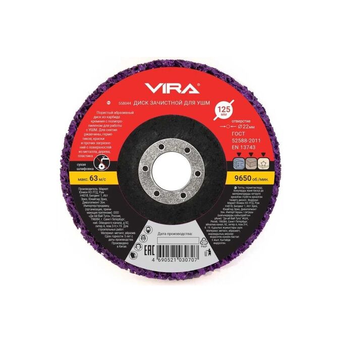 Круг зачистной 125 мм VIRA 558044 для снятия ржавчины, герметиков, краски и других материалов. Предназначен для работы с УШМ.