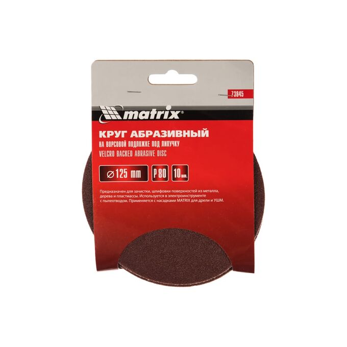 Абразивный круг на ворсовой подложке под «липучку» Matrix Р80 арт. 73845 используется для сухого первичного шлифования металла, дерева, пластика и других поверхностей. Круг устанавливается на эксцентриковые (орбитальные) шлифовальные машинки или на дрель с помощью опорной насадки Matrix.