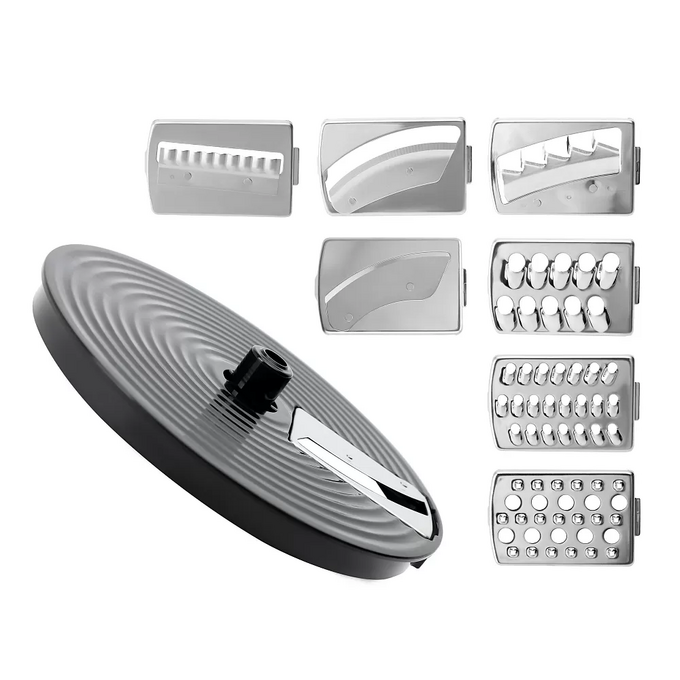 • Набор лезвий для нарезки – 7 шт (волнообразное лезвие, для нарезки тонких ломтиков, для нарезки толстых ломтиков, для нарезки картофеля фри, для нарезки тонкой соломки, для нарезки толстой соломки, для измельчения);