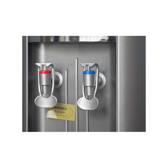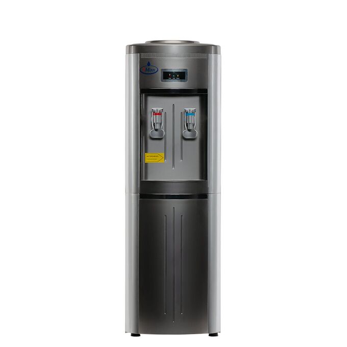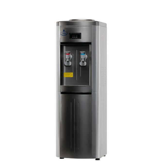 Кулер для воды SMixx 178 LD серебристо - серый - не классическая модель серебристо - серого цвета и шкафчиком (не холодильником) объёмом 16 л. Форма данной модели водного диспенсера с явно выраженными закруглёнными углами спереди. Сверху - три индикационные лампочки. Красная, зеленая и оранжевая. Лампочки - это своего рода индикация нагрева (красного цвета), охлаждения (зеленого цвета) и "спящий" режим - горит лампочка оранжевого цвета (когда нет подогрева воды). Нагрев воды осуществляется с помощью встроенного в бак ТЭНа (нагревательного элемента). С помощью термодатчика нагрева температура горячей воды поддерживается в диапазоне 85 - 90 °C. Объем бака нагрева составляет 1,2 литра, что позволяет за один раз набрать 2 - 3 стакана горячей воды. Подача воды осуществляется с помощью 2-х кранов. Тип подачи - нажим кружкой. Сзади предусмотрены 2 кнопки. Кнопка красного цвета отвечает за включение и выключения нагрева воды. Кнопка зеленого цвета - за включения и выключение системы охлаждения воды.