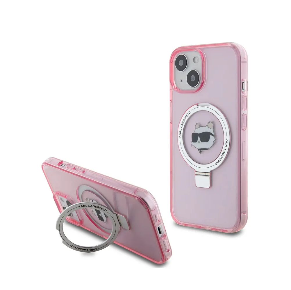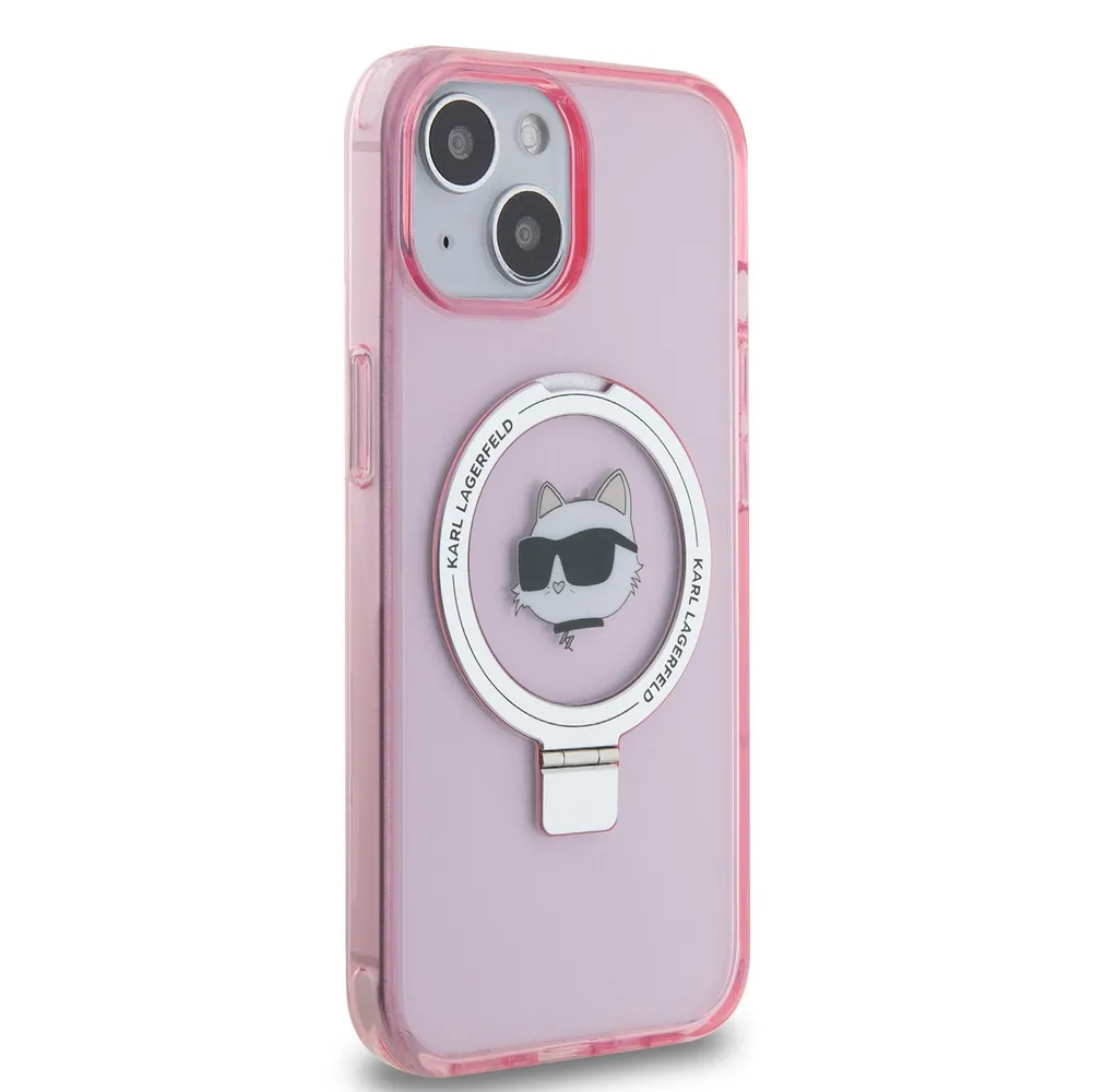 Lagerfeld для iPhone 15 чехол PC/TPU + Ring stand NFT Choupette head Hard Pink (MagSafe)