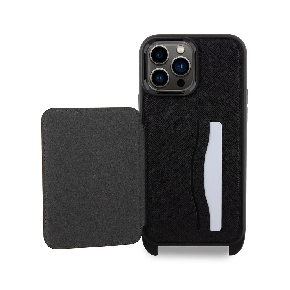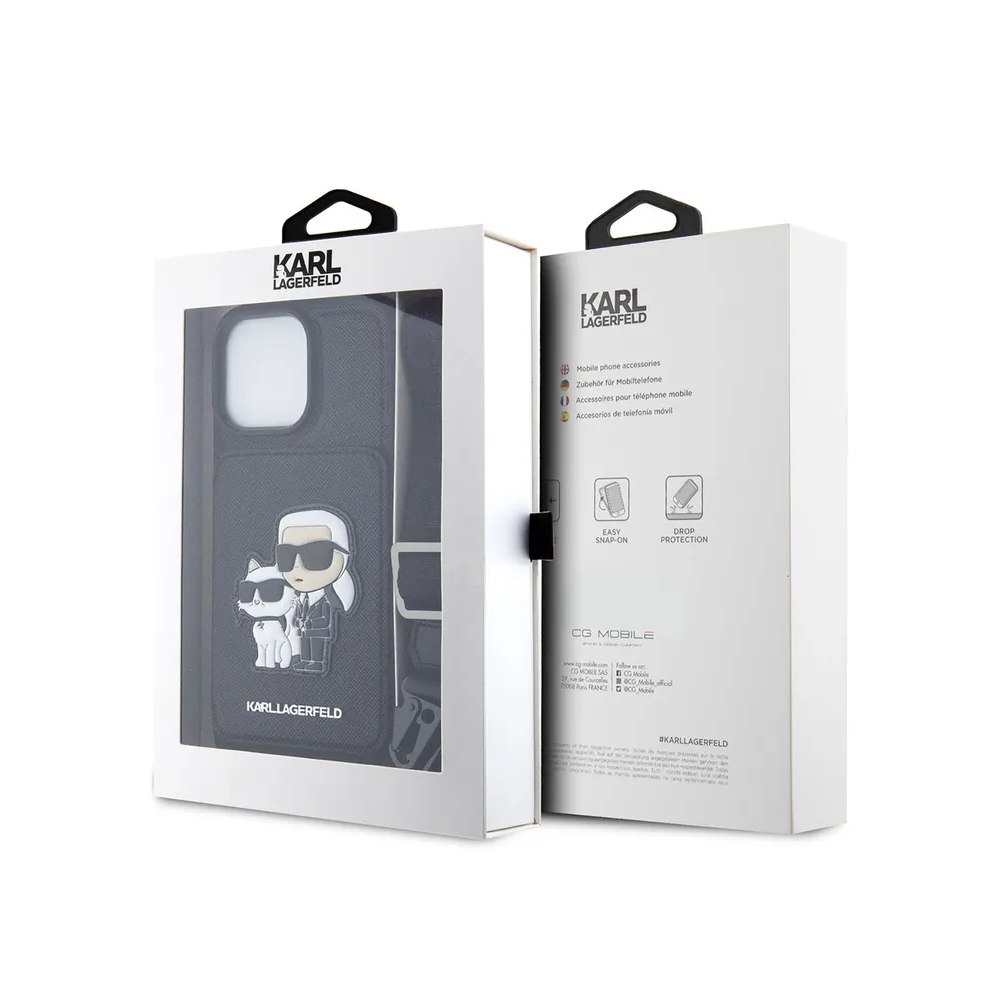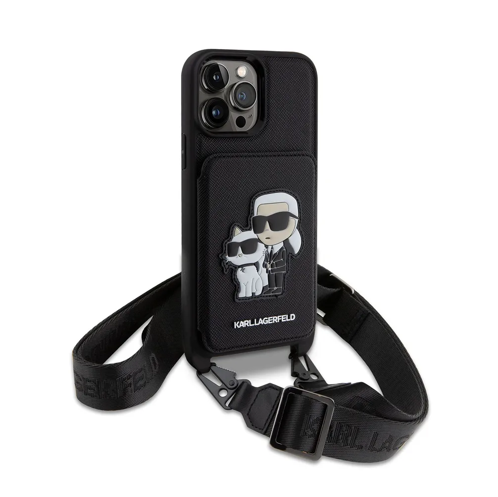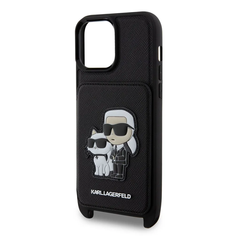 Lagerfeld для iPhone 15 Pro Max чехол Crossbody cardslot PU Saffiano NFT Karl&Choupette Hard Black
