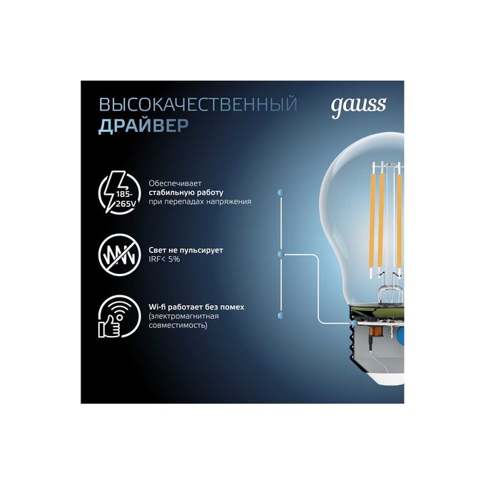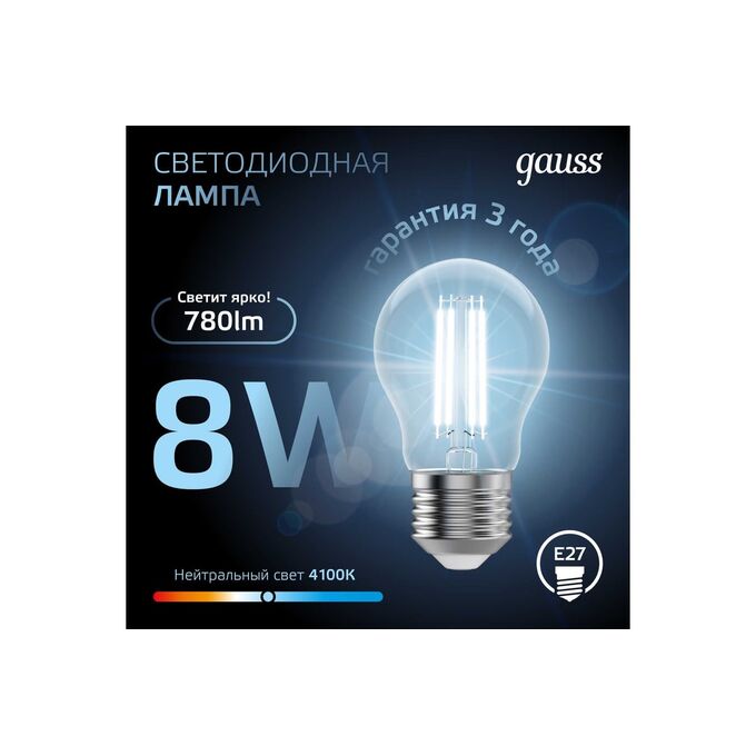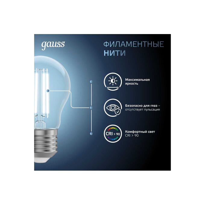Светодиодные филаментные лампы GAUSS - это новейшие технологии в светотехнике. Лампы имеют привычный вид классических ламп накаливания, освещают пространство на 360и дают больше света по сравнению с обычными светодиодными лампами за счет прозрачной колбы.