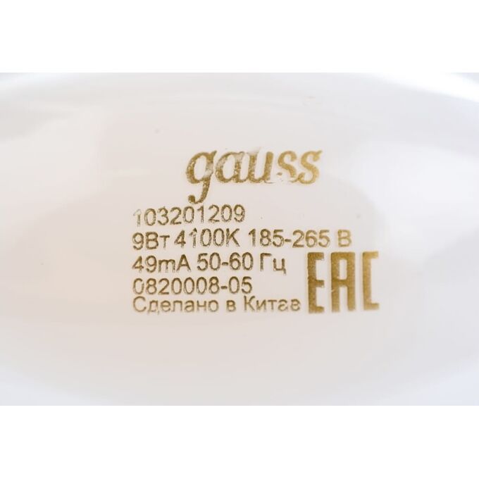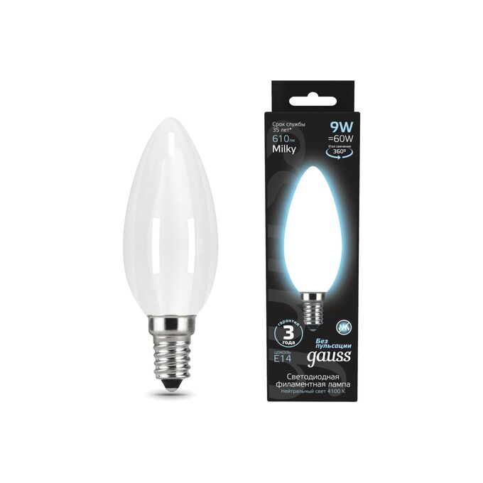 Технические характеристики Gauss Filament свеча, 9W, 610lm, 4100К, Е14, milky LED 103201209