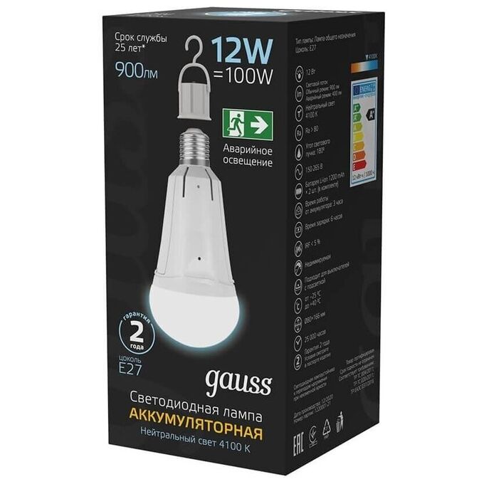 1.Аварийная лампа Gauss A80 12W 900lm 4100K Е27 с Li-Ion аккумулятором LED 1/5/50 102002212 продолжает работать при отключении электропитания.