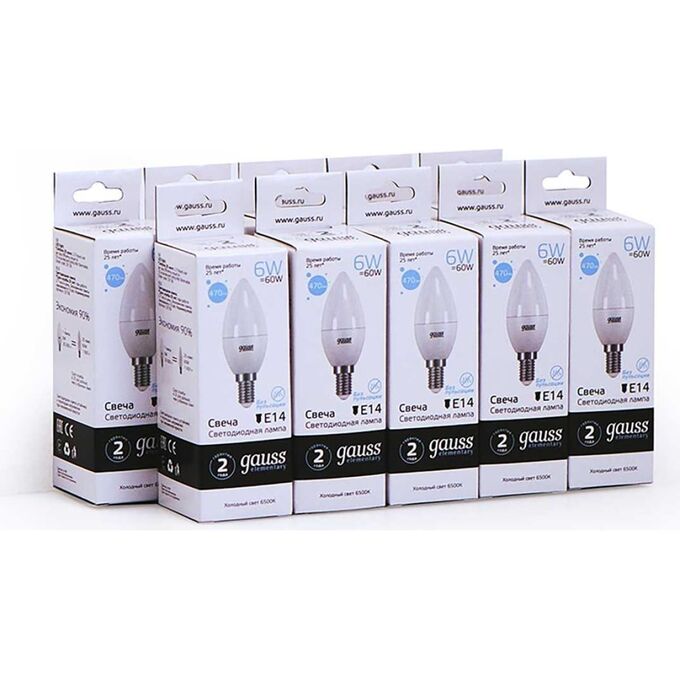 Лампа светодиодная Gauss Elementary 33136 6Вт цок.E14 C37 свеча 220B 6500K св.свечения белый холодный уп/10шт