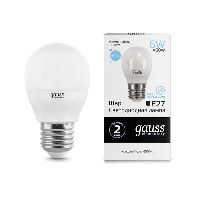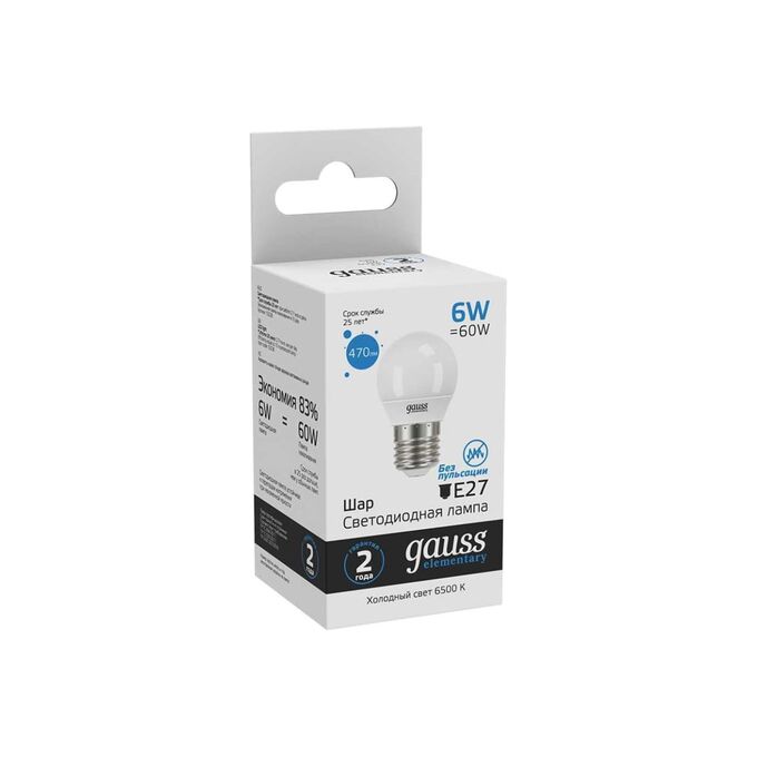 Технические характеристики Gauss LED Elementary Шар 6W E27 470lm 6500K 53236