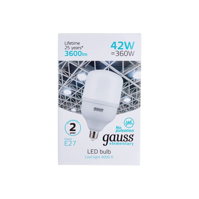 Лампа Gauss Elementary LED T120 E27 42W 3600lm 180-240V 4000K 63224 высокой мощности в основном используется в освещении помещений большой площади и высокими потолками (от 3,5 метров), а также уличных системах освещения.