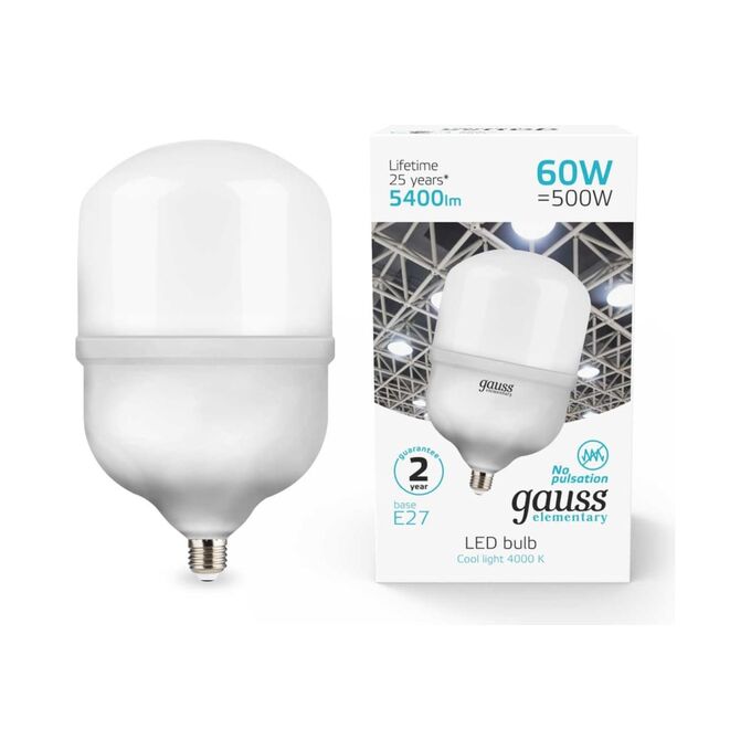 Лампа Gauss Elementary LED T160 E27 60W 5400lm 5400lm 180-240V 4000K 63226 высокой мощности в основном используется в освещении помещений большой площади и высокими потолками (от 3,5 метров), а также в уличных системах освещения.