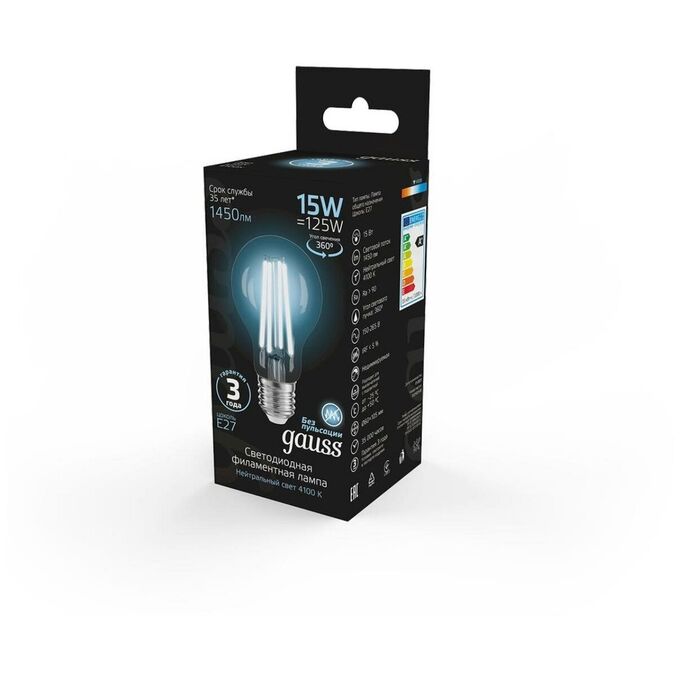 Технические характеристики Gauss Filament А60, 15W 1450lm, 4100К, Е27, LED, 1/10/40 102902215