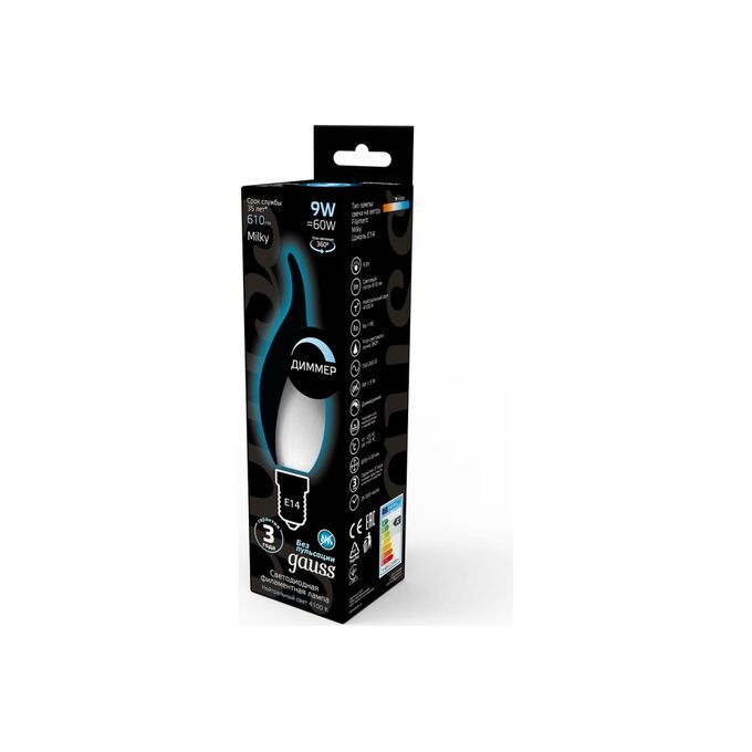 Технические характеристики Gauss Filament свеча на ветру, 9W, 610lm, 4100К, Е14, milky, LED 104201209-D