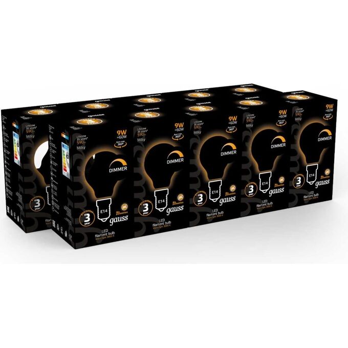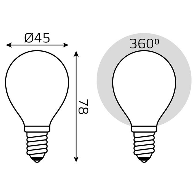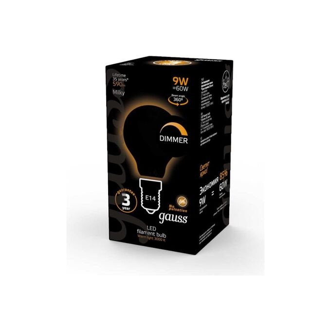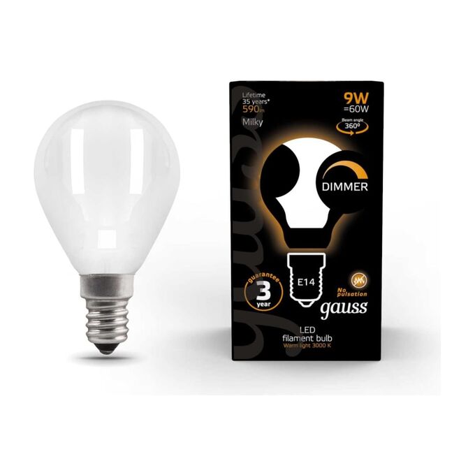 Технические характеристики Gauss Filament шар, 9W, 590lm, 3000К, Е14, milky, LED 105201109-D