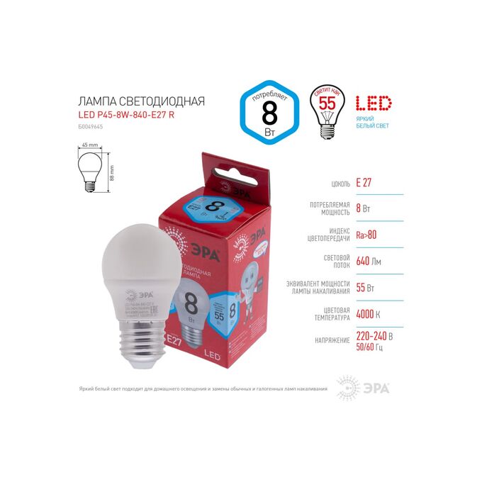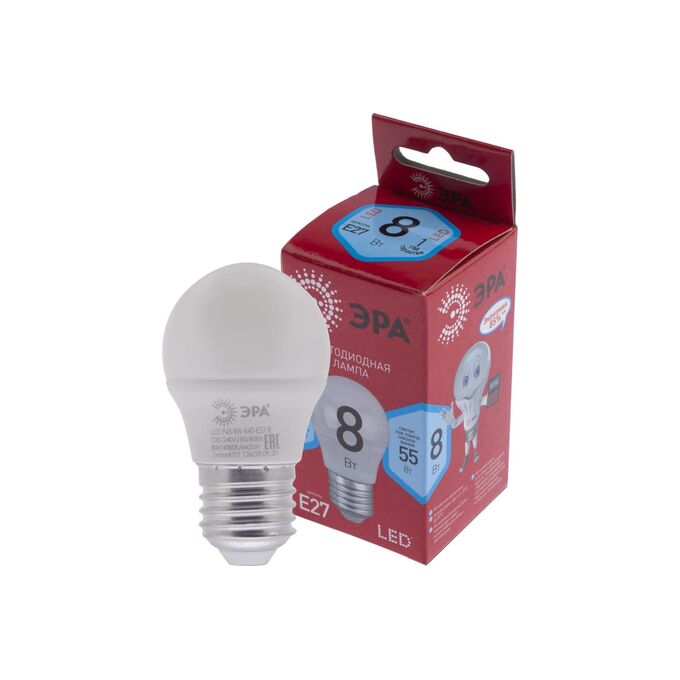 Лампочка Эра LED P45-8W-840-E27 R (Б0049645) (диод, шар, 8Вт, нейтр, E27) (10/100/3600)