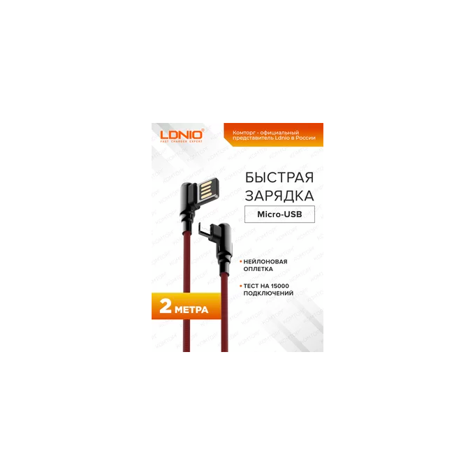 LDNIO LS422/ USB кабель Micro/ 2m/ 2.4A/ медь: 120 жил/ Угловой коннектор/ Нейлоновая оплетка/ Red