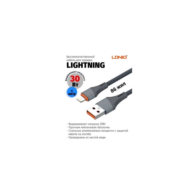 Кабель LDNIO LS631/ USB-Lightning/ 1m/ 30W/ медь: 86 жил/ Нейлоновая оплетка/ Серый
