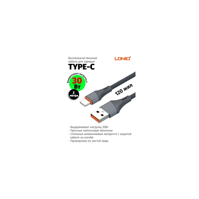 LDNIO LS632/ USB кабель Type-C/ 2m/ 30W/ медь: 120 жил/ Нейлоновая оплетка/ Gray