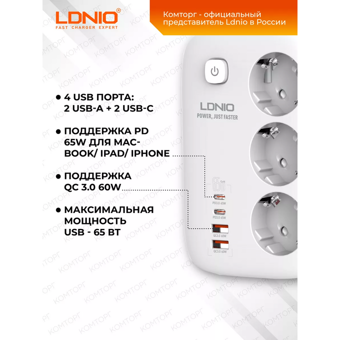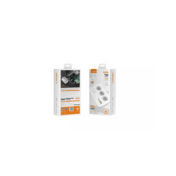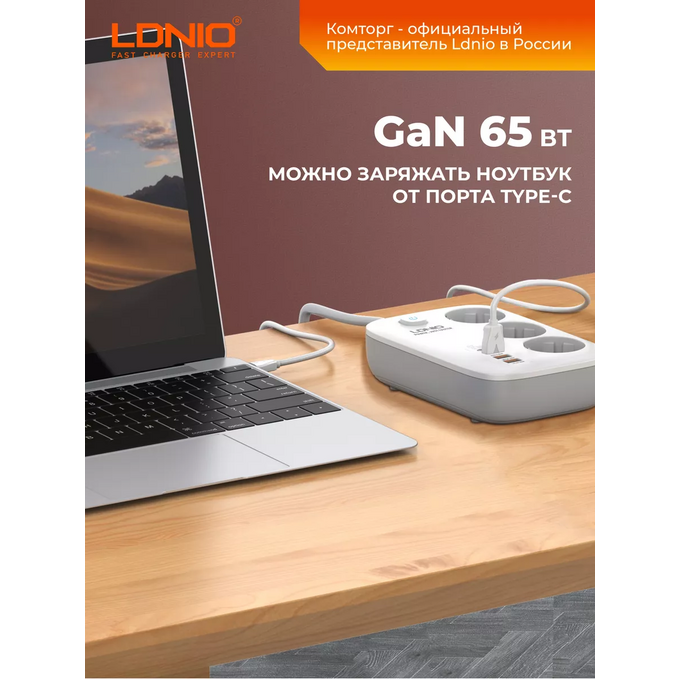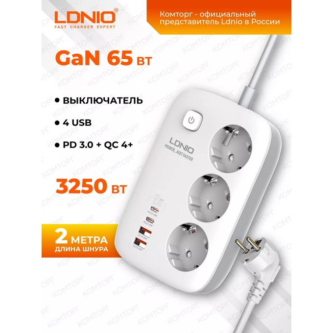 Сетевой удлинитель LDNIO SE3436 / 2м/ 3 розетки/ 3250W/ 4 USB: QC 4.0+PD 3.0+PPS/ GAN 65W/ белый