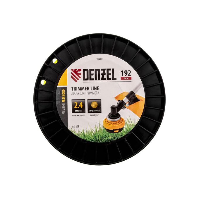 Леска для триммера Denzel FLEX CORD 96280 круглого сечения, диаметром 2,4 мм и длиной 192 м, на DIN-катушке, предназначена для скашивания как мягкой, молодой травы, так и более густой растительности. Подходит для бензиновых триммеров с объемом двигателя 25-52 см3 и электрических триммеров мощностью от 1 до 1,5 кВт.