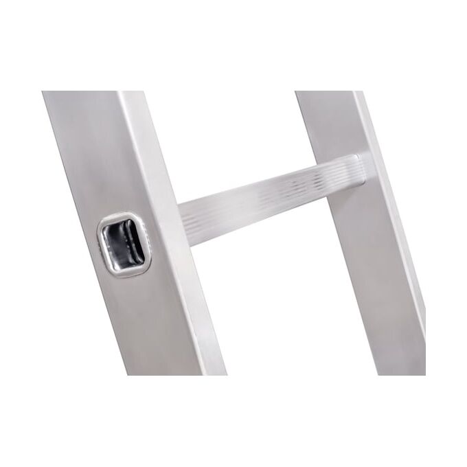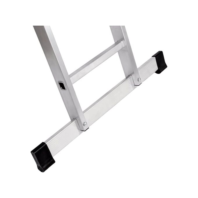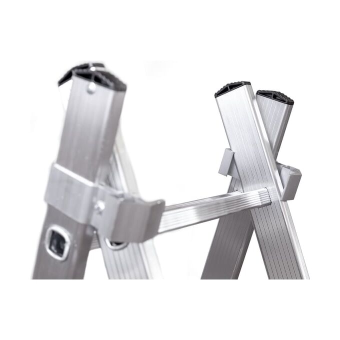 Имеет широкие алюминиевые скобы, обеспечивающие плотный зажим выносной секции и прочные страховочные стяжки, предохраняющие лестницу от самопроизвольного раскладывания.