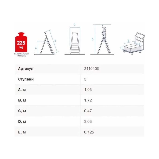 Стремянка разработана для долговременного профессионального применения. Имеет антискользящие опорные наконечники из пластика, безопасную площадку и широкие ступени глубиной 80 мм. При хранении не занимает много места, а благодаря небольшому весу легко транспортируется.