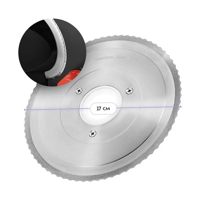 Нож выполнен из нержавеющей стали и имеет волнообразный край. Дисковый нож можно снять с устройства для заточки или очистки, открутив фиксатор дискового ножа по часовой стрелке и осторожно потянув нож в сторону.