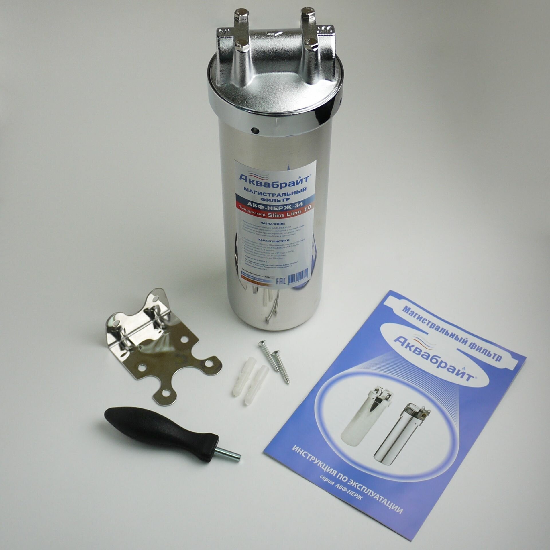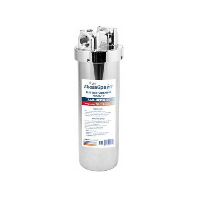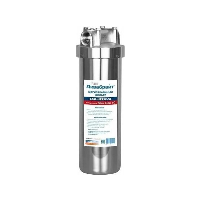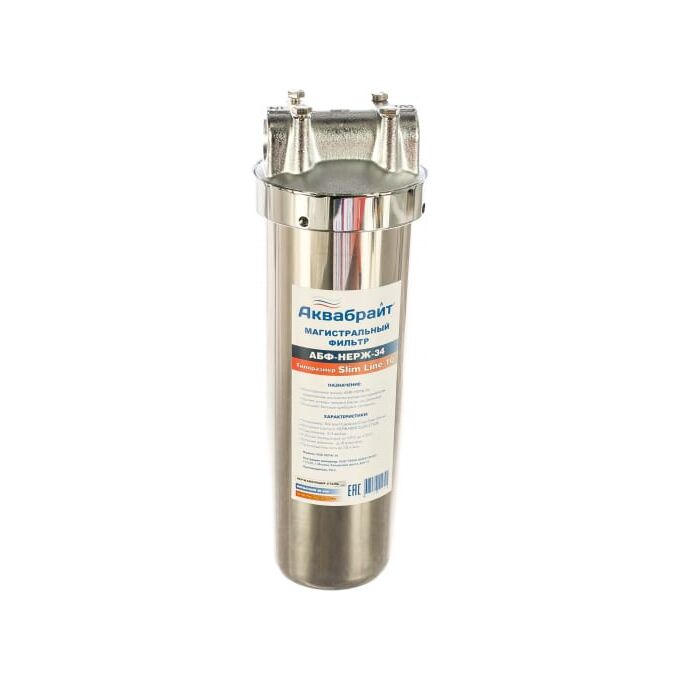 Магистральный Фильтр из НЕРЖАВЕЮЩЕЙ СТАЛИ. АБФ-НЕРЖ-34, Типоразмер СЛИМ ЛАЙН 10 дюймов. В комплекте Кронштейн и ключ. Подключение 3/4 дюйма.