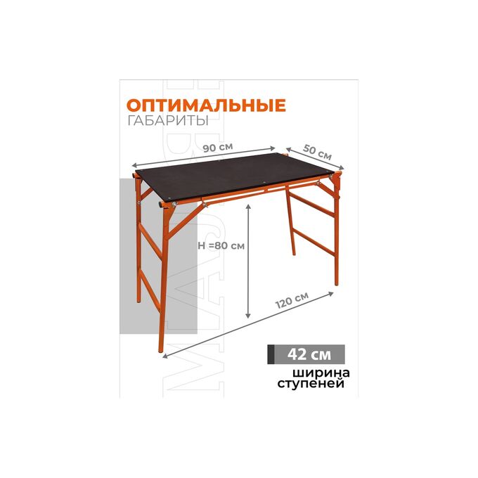 Ножки столика – лестница с двумя ступеньками шириной 42 см, по которой удобно подниматься рабочую площадку. Она находится на высоте 80 сантиметров от пола.
