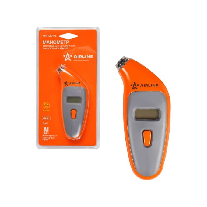 Металлический цифровой манометр с подсветкой Airline 7 атм APR-MD-06 служит для определения уровня избыточного давления в автомобильных шинах.