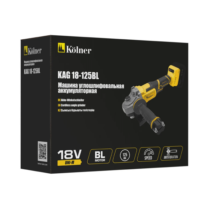 Машина углошлифовальная аккуммуляторная Kolner KAG 18-125BL 18V UNI-M, BL, 125мм,, 5200-7500об/мин, быстрозажим.кожух, AV рукоятка (без акб и зу)