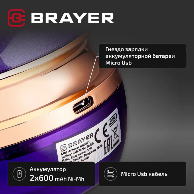 BRAYER BR5031 оснащена съёмным резервуаром для катышков, что делает процесс чистки ещё удобнее. Работа устройства обеспечивается двумя мощными аккумуляторами ёмкостью по 600 mAh каждый, что гарантирует длительное время работы без необходимости частой подзарядки. Технология аккумуляторов Ni-Mh обеспечивает высокую производительность и долгий срок службы.
