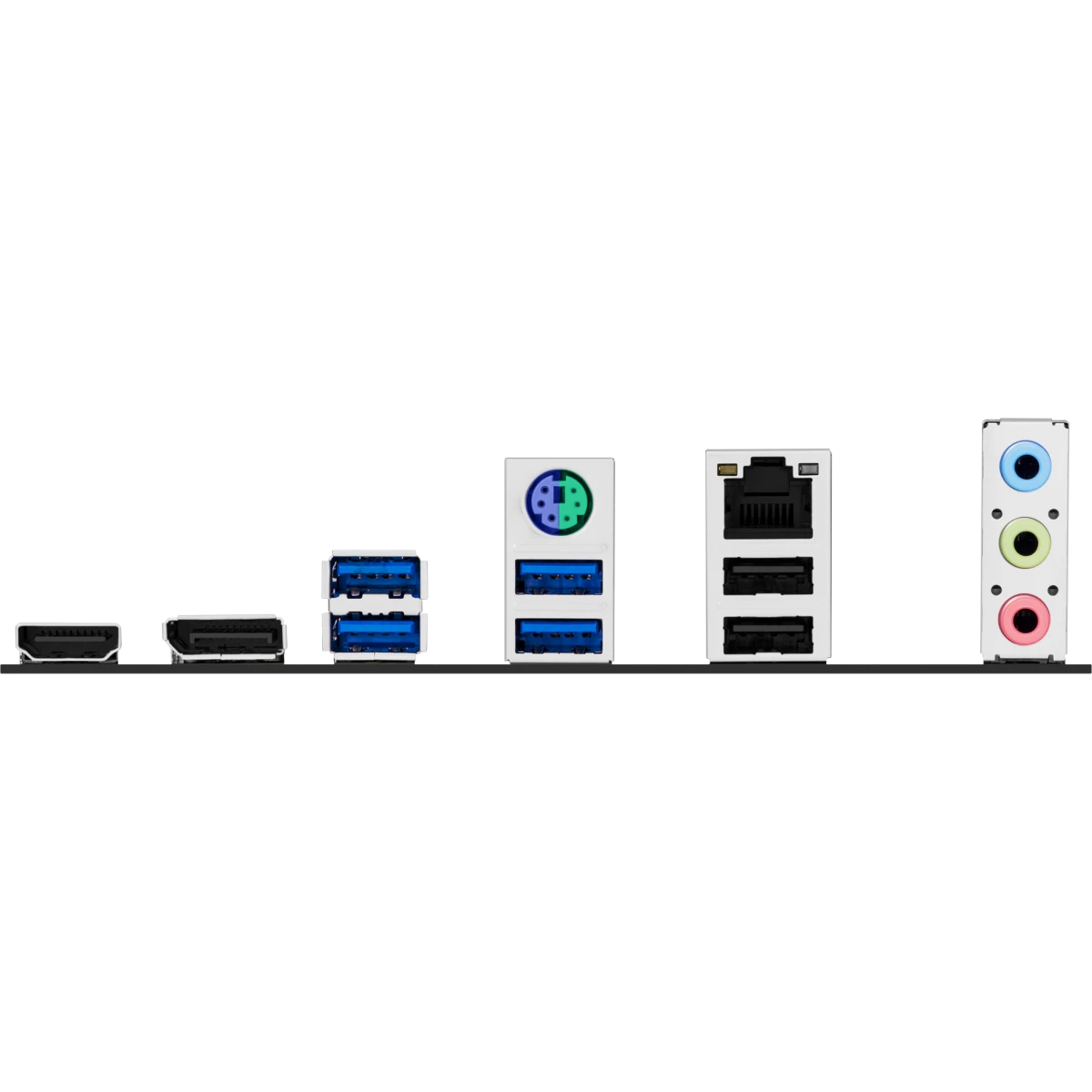PS/2, 2 x USB 2.0, 4 x USB 3.2 Gen1, HDMI, DisplayPort, RJ-45