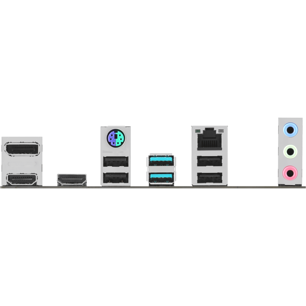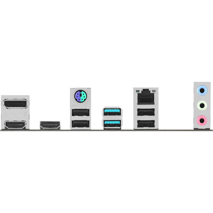 PS/2, 4 x USB 2.0, 2 x USB 3.2 Gen2, 2 x HDMI, DisplayPort, RJ-45