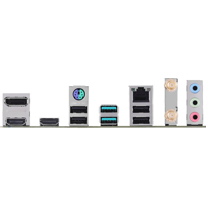 PS/2, 4 x USB 2.0, 2 x USB 3.2 Gen2, 2 x HDMI, DisplayPort, RJ-45