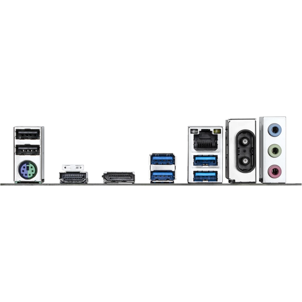 PS/2, 2 x USB 2.0, 4 x USB 3.2 Gen1, HDMI, DisplayPort, RJ-45