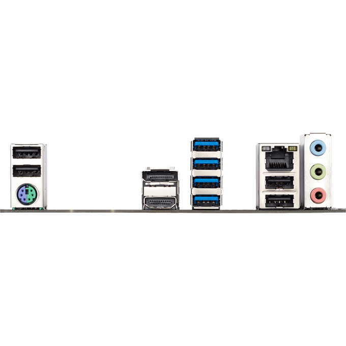 PS/2, 4 x USB 2.0, 4 x USB 3.2 Gen1, HDMI, DisplayPort, RJ-45