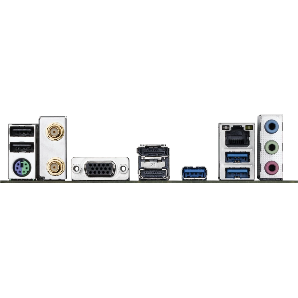 PS/2, 2 x USB 2.0, 3 x USB 3.2 Gen1, VGA, HDMI, DisplayPort, RJ-45