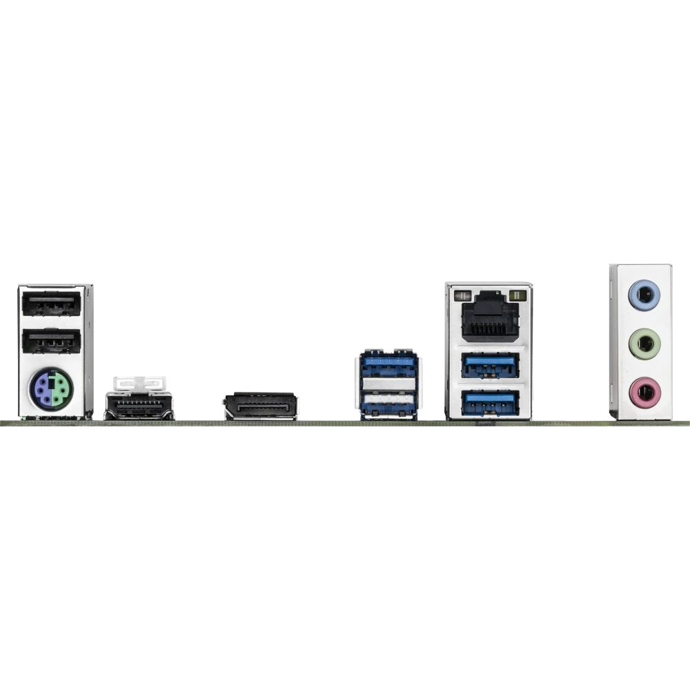 PS/2, 3 x USB 2.0, 3 x USB 3.2 Gen1, HDMI, DisplayPort, RJ-45