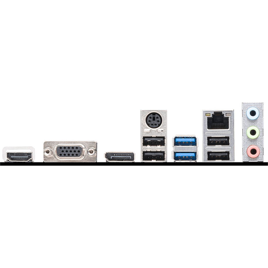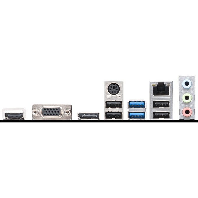 PS/2, 4 x USB 2.0, 2 x USB 3.2 Gen1, VGA, HDMI, DisplayPort, RJ-45