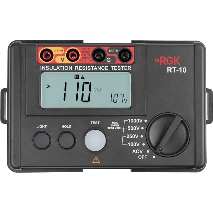 Электронный мегаомметр RGK RT-10 поставляется готовым к работе, батарейки и провода включены в набор. Хранить и перевозить устройство можно в специальном чехле, а на объекте его защитит прочная крышка.