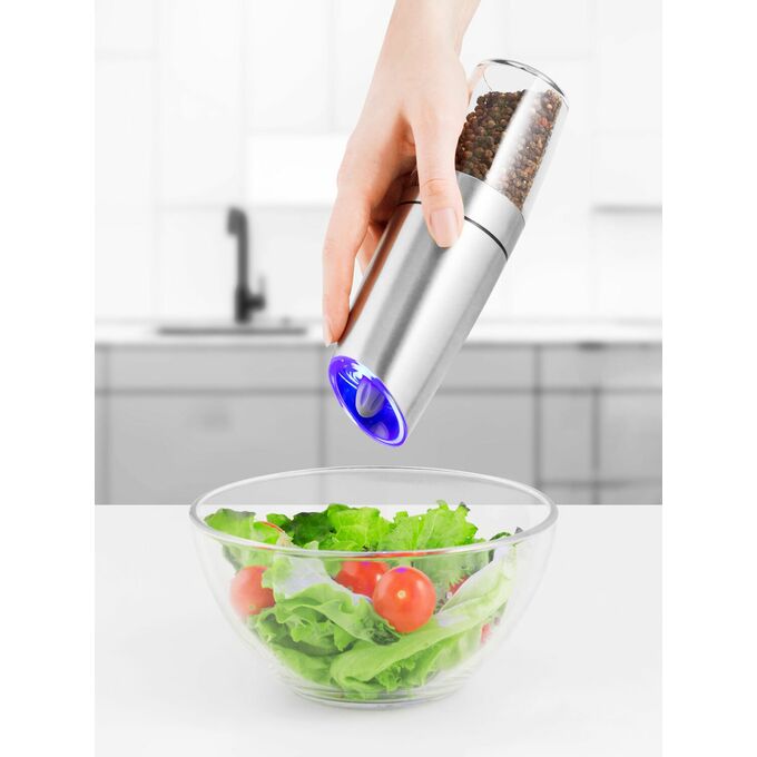 Электрическая мельница для специй, морской соли, перца и различных трав снабжена регулировкой помола (крупный, средний и мелкий помол) и подсветкой для освещения приправляемых блюд.