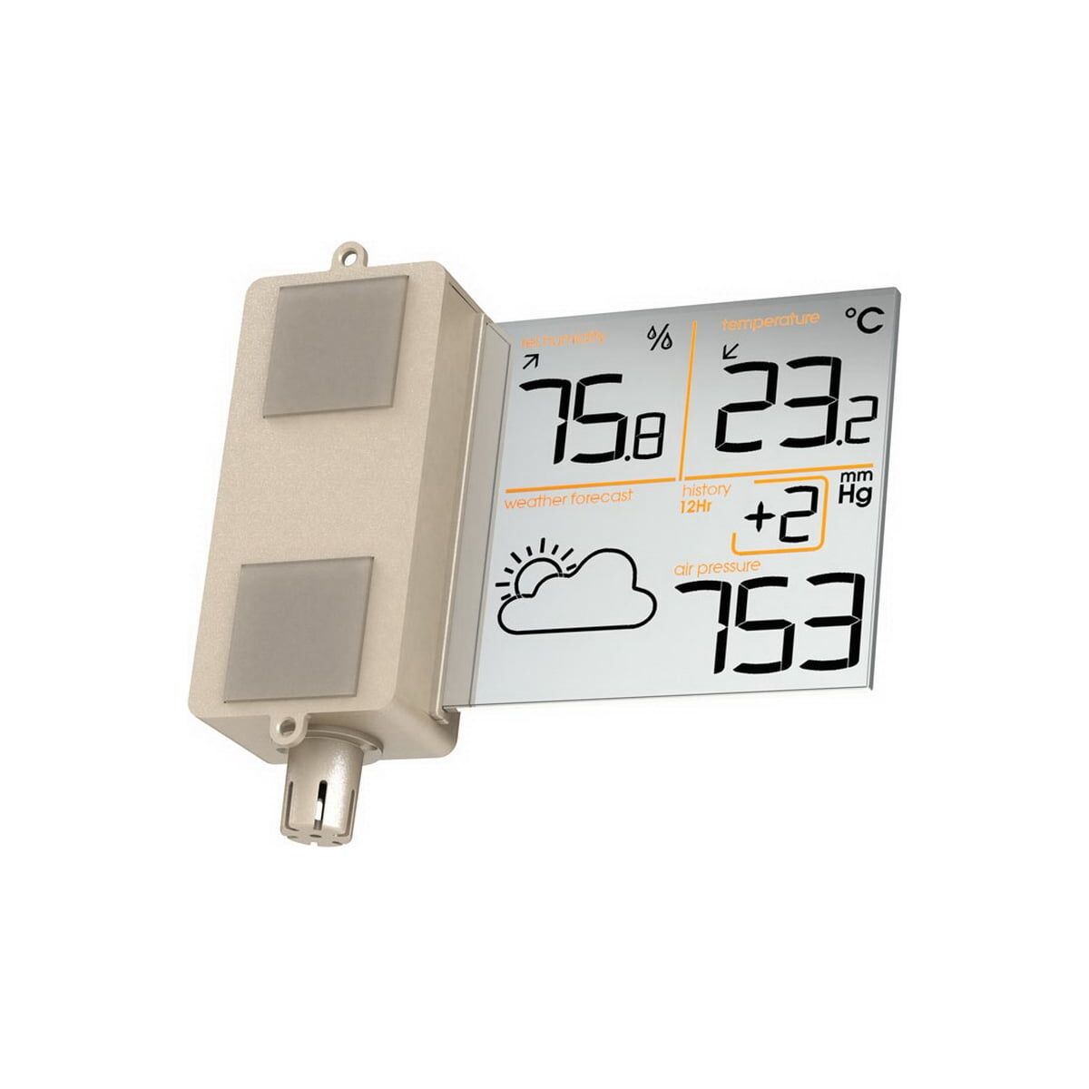 Метеостанция показывает графический прогноз погоды, атмосферное давление в миллиметрах ртутного столба, историю изменения атмосферного давления за прошедшие 12 часов, температуру и влажность воздуха за окном.