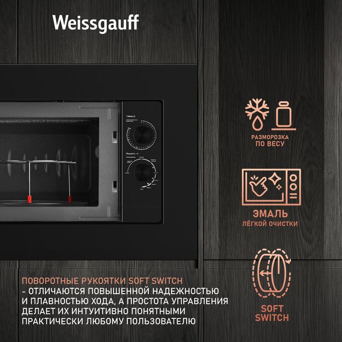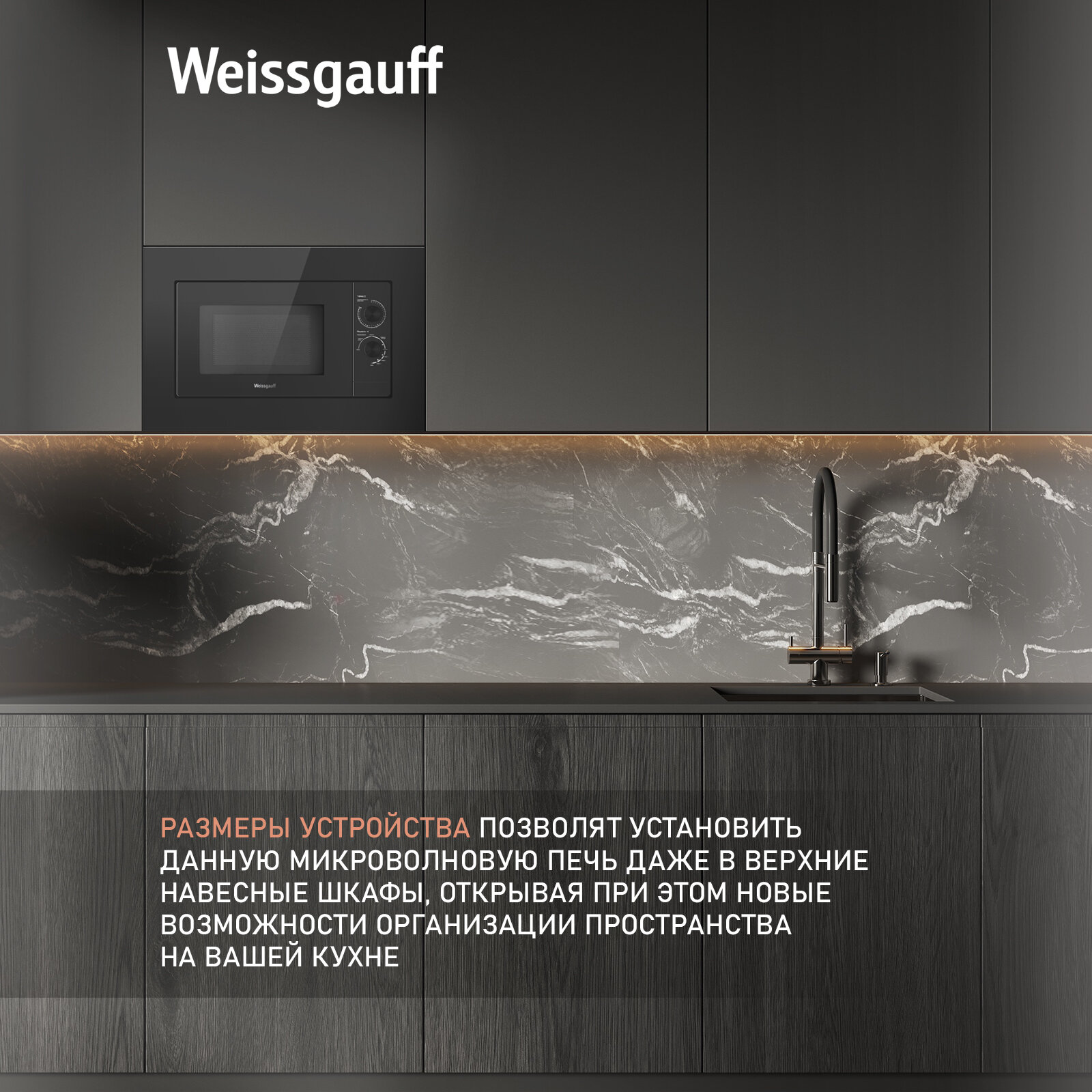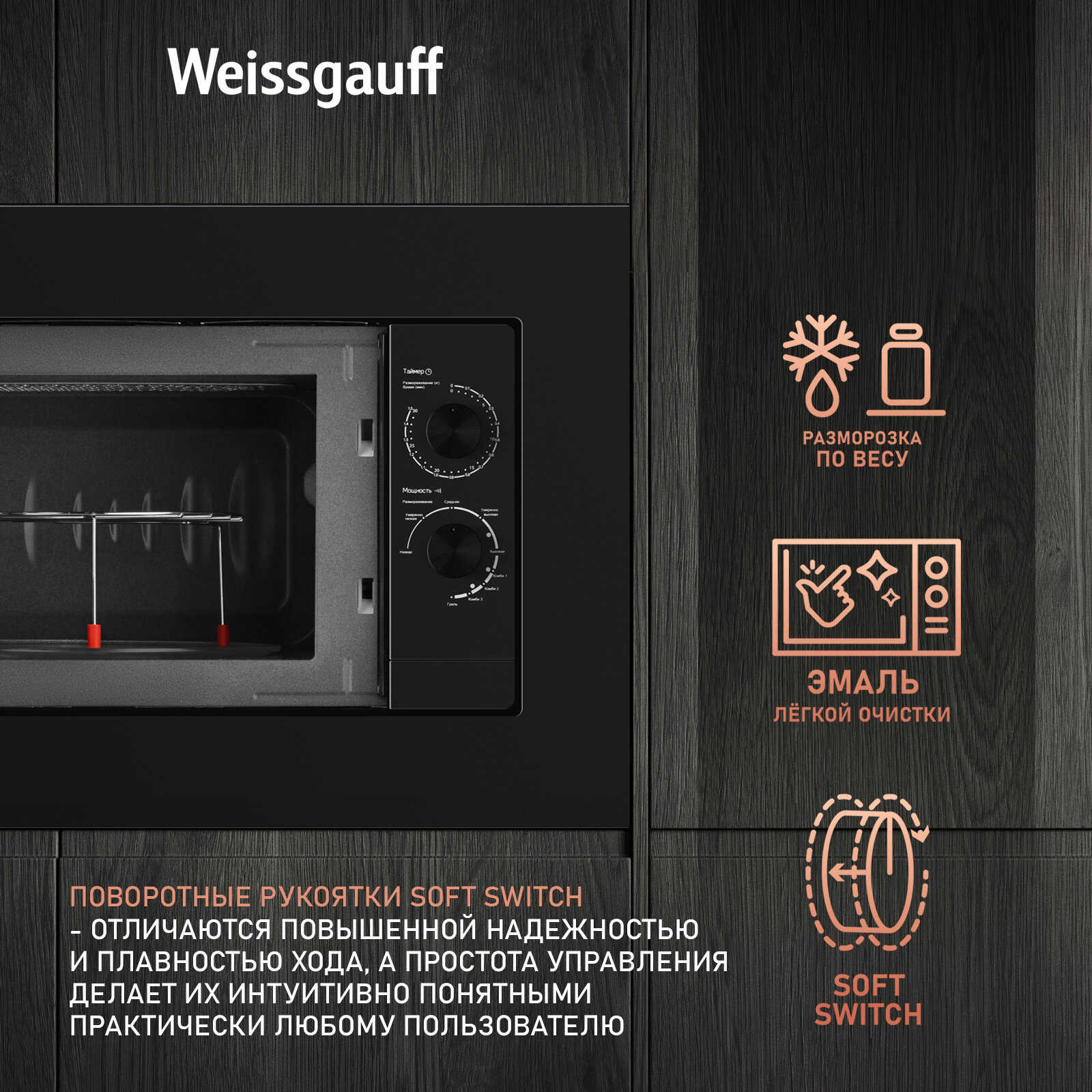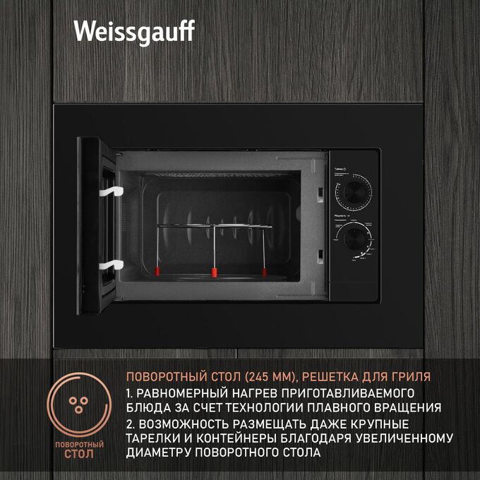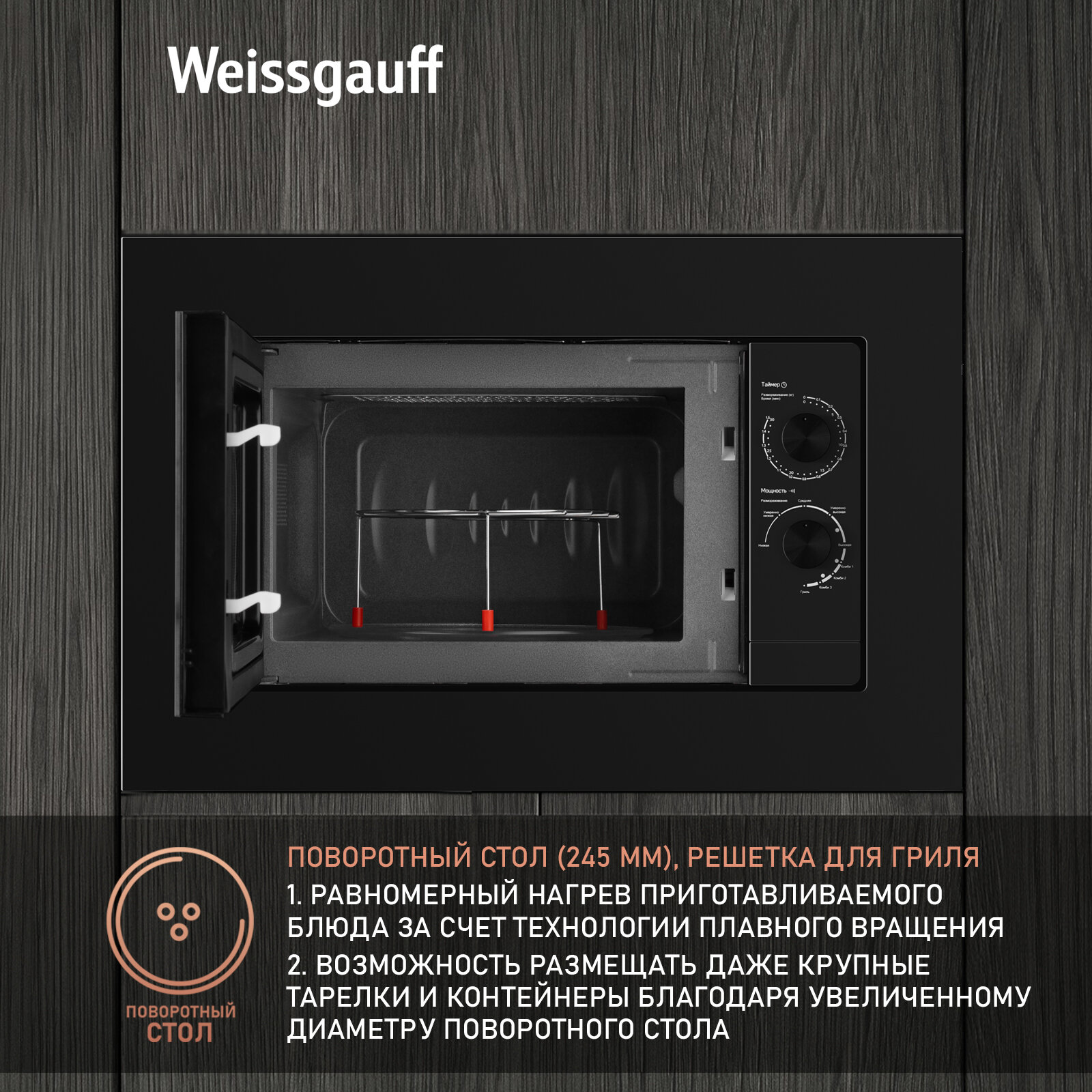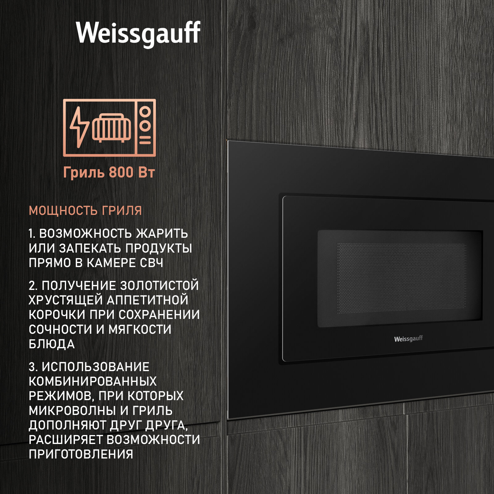 Встраиваемая микроволновая печь Weissgauff с объемом 20 литров, выполненная в черном закаленном стекле, равномерно разогревает еду при помощи поворотного стола, а также оснащена грилем с возможностью работы в комбинированном режиме!