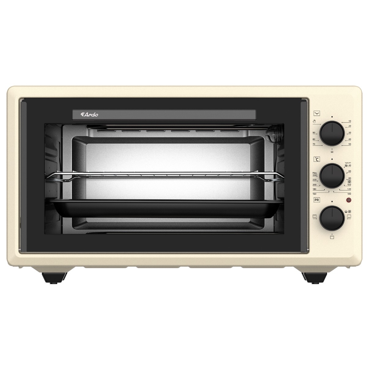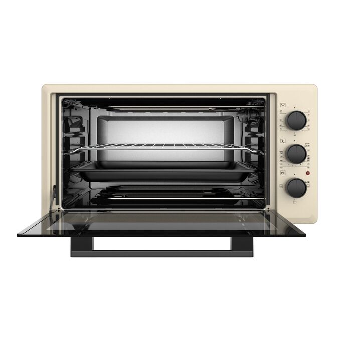 Комплектация мини печь; 1 стандартный эмалированный квадратный противень; 1 решетка; 1 эмалированный круглый противень