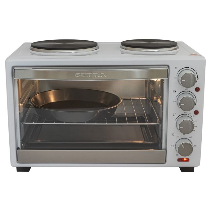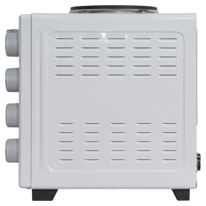 электропечь, металлическая решетка, плоский противень, круглая форма для пиццы, ухват для противня, вертел, ухват для вертела, инструкция на русском языке