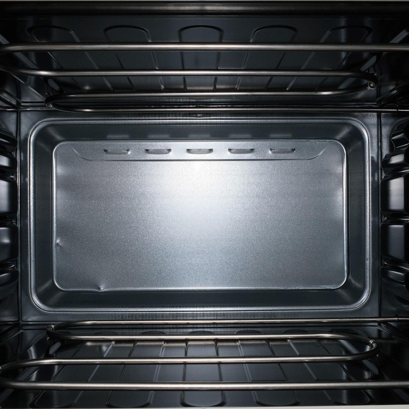 Термостойкое стекло даёт возможность контролировать ход приготовления. Внутренняя камера сделана из нержавеющей стали, которая устойчива к коррозии, перепаду температур и механическим повреждениям. Отличным подспорьем при готовке послужат: противень, решётка и круглый поднос для пиццы, идущие в комплекте. Противоскользящие ножки обеспечивают устойчивость на гладкой поверхности.