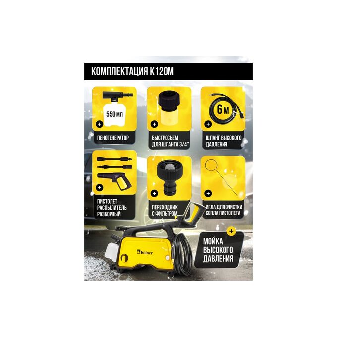 Мойка Kolner K120M подходит для очистки различных поверхностей: фасадов зданий, автомобилей, дорожек, заборов, садовой мебели и многого другого.